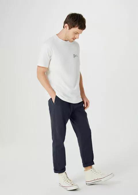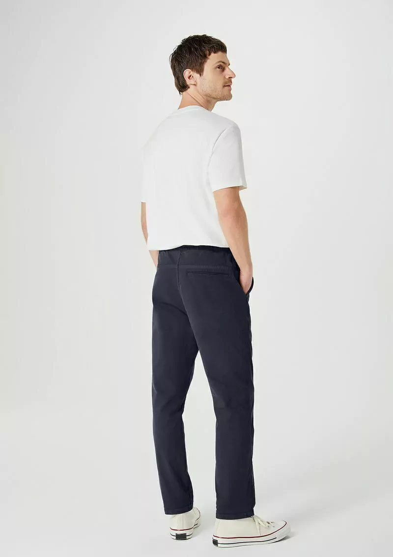 Calça Em Sarja Masculina Jogger. Confeccionada em sarja de algodão e elastano, possui modelagem jogger que traduz uma calça com cintura e tornozelos marcados com elástico. Conta com cós com cadarço para ajuste e bolsos faca nas laterais da peça. É estilosa e muito versátil, podendo ser combinada com praticamente tudo.
